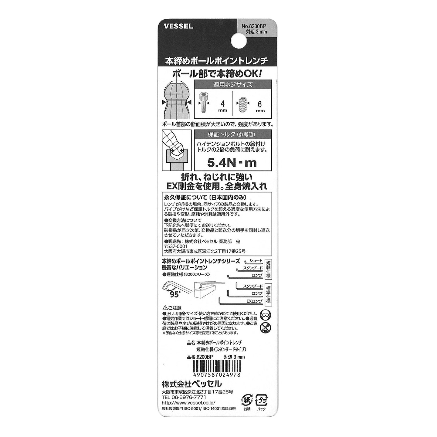 标示 主体总长mm L型扳手的短边尺寸mm 主体重量g 内包装数量 外包装数量 日本JAN条形码