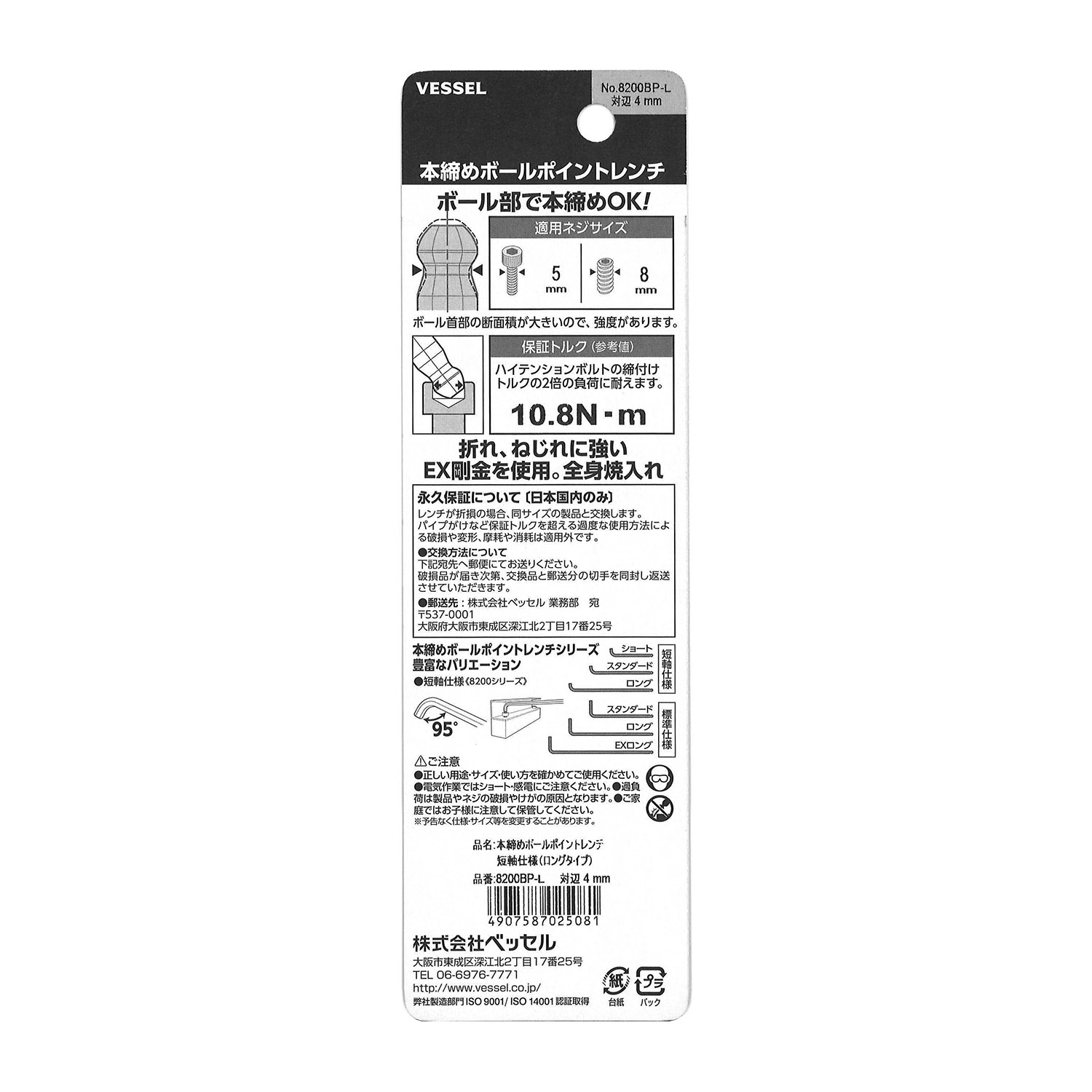 | 标示 | 主体总长mm | L型扳手的短边尺寸mm | 主体重量g | 内包装数量 | 外包装数量 | 日本JAN条形码 |