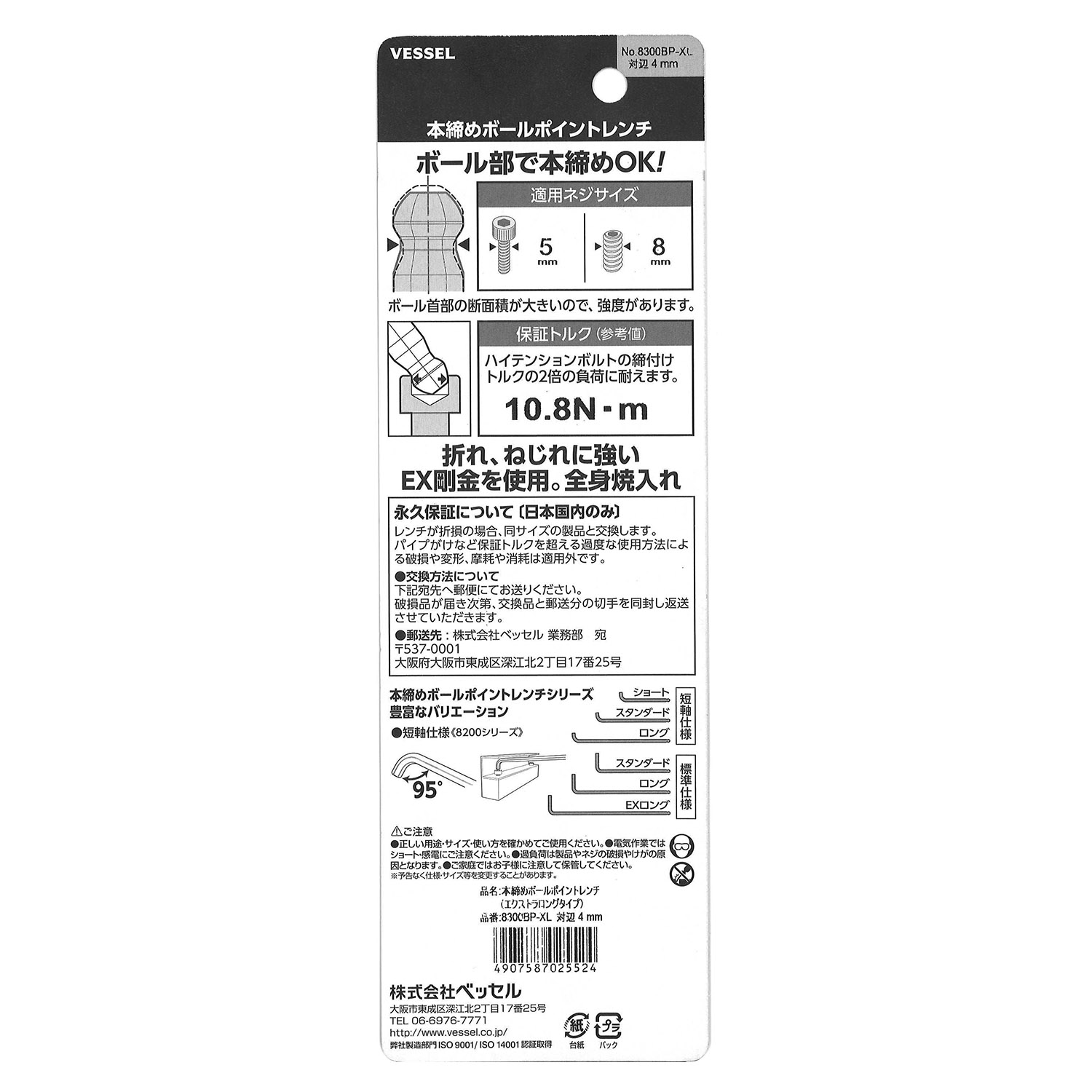标示 主体总长mm L型扳手的短边尺寸mm 主体重量g 内包装数量 外包装数量 日本JAN条形码
